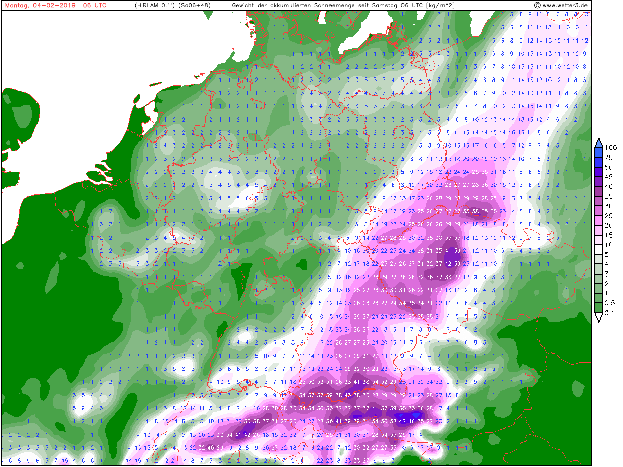 Jeden z modelů, kolik sněhu připadne do pondělního rána 4. února: