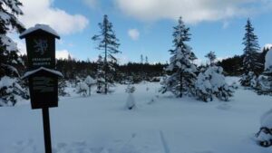 Na Malém Polci září oslnivě sníh. Mířím k jezírku. Našlapuju opatrně na drny, abych se neprobořil do rašeliny. Ještě není úplně zamrzlá a sněhu