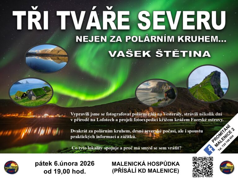 TŘI TVÁŘE SEVERU nejen za polárním kruhem – VAŠEK ŠTĚTINA v pátek 6. února 2026 od 19,00 hod v přísálí KD Malenice (Malenická Hospůdka). V premiéře této přednášky Vás čekají