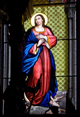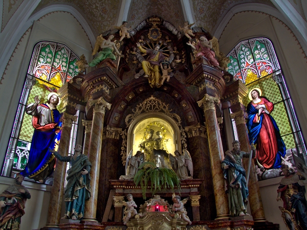 Každého návštěvníka tu jistě uprostřed vší historické nádhery zaujme zejména barokní oltář (zhotovený sochařem a uměleckým řezbářem Philippem Ramblerem z Freistadtu na základě návrhu vypracovaného roku 1702 proslulým architektem Johannem Bernhardem Fischerem z Erlachu), po jehož obou stranách nepřehlédnutelně září dvě bohatě zdobená malovaná okna s postavami světců v bezmála životní velikosti – nalevo Ježíše Krista, napravo Panny Marie. A právě tady jsme u hlavního cíle, před jehož bližším představením však ještě učiníme jednu nutnou odbočku. Nejdříve je totiž zapotřebí mírně rozplést předivo dávných příběhů, které se váží k obrazu v úvodu zmíněné „vimperské světice“ i jejího syna. Hlavní role v nich náležejí především dvěma mužům – majiteli skláren a malíři – a samozřejmě i jedné ženě, neboť právě ona je dnes, jak plyne už ze samotného nadpisu, ústředním tématem. Životní cesty všech tří se proťaly v předminulém století právě u nás na Šumavě.