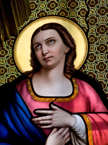 Detailní výřez z obrazu Panny Marie nám ve skutečnosti nabízí pohled do tváře snachy Wilhelma Kralika Anny, manželky jeho druhého syna a v celkovém pořadí třetího potomka – Wilhelma Kralika juniora, s nímž otec počítal jako s příštím dědicem celého rodinného sklářského komplexu. Zatímco Panna Maria byla podle biblických legend matkou jediného syna – Ježíše Krista, …