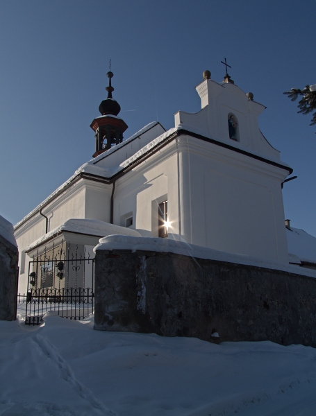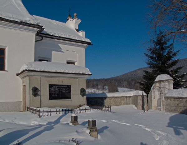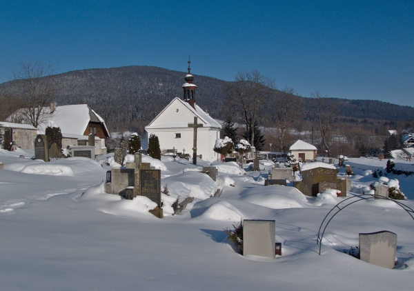 Hned k prvnímu ze snímků bohatě sněhem zapadlého hornovltavického hřbitova určitě není zapotřebí žádných komentářů. Silueta našeho majestátního šumavského velikána, pod jehož ochranou jako by se celá zahrada smrti nacházela, je nepřehlédnutelná. Jistě ovšem stojí dále za připomenutí, že první střecha zleva náleží faře, jež byla po dlouhá léta minulého století letním bytem velkého českého herce Zdeňka Štěpánka, jehož manželka navždy odpočívá právě na zdejším hřbitově. Oba jeho synové, rovněž známí herci – Martin a Petr – pak v dětství ministrovávali ve vedle stojícím kostele Panny Marie, svatého Josefa a svatého Jana Nepomuckého. Milovníky pohádek by pro změnu mohlo zajímat, že svou církevní svatbu tu měli král Miroslav a princezna Krasomila, přesněji řečeno jejich herečtí představitelé Vladimír Ráž a Alena Vránová. Stalo se roku 1957. Ale kostel nás dnes bude zajímat především ze zcela jiného důvodu … pojďme k němu blíže.