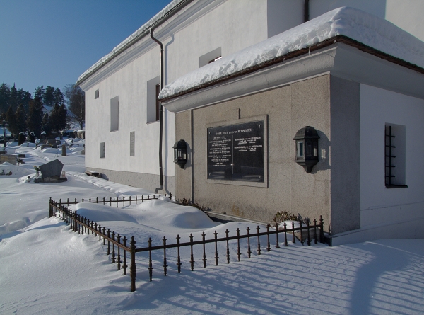 Stavbou, která tu navazuje na kostelní zeď, je rodová hrobka Kraliků …