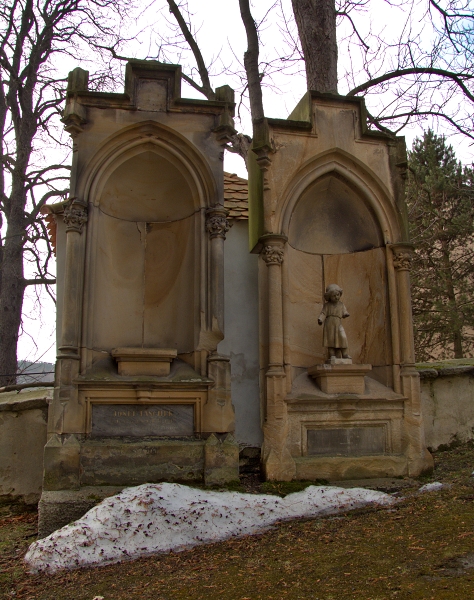 Naše putování započalo u největšího z celkem tří vimperských kostelů a zakončíme je pro změnu poblíže nejstaršího – kostela svatého Bartoloměje. Dodnes můžeme na místě, které bylo až do roku 1901 jediným městským hřbitovem, spatřit torza pseudogotických pískovcových náhrobků Josefa Taschka a Wilhelma Kralika staršího. Stojí dokonce svorně vedle sebe přímo naproti vchodu do kostela, jen z jejich někdejší sochařské výzdoby už nezbylo nic. Malý bezruký invalidní andělíček, klopící smutně hlavu na Kralikově náhrobku, sem původně nepatřil – zaujímá tu místo samotného Ježíše, jehož socha kdysi vyplňovala, podobně jako socha anděla v případě Josefa Taschka, celý výklenek v plné jeho výši. Shora pak byl každý z náhrobků zakončen dvěma fiálami (dekorativními štíhlými jehlany) po stranách a křížem uprostřed. Tato někdejší podoba však vzala definitivně zasvé, ostatně i hroby obou společníků se nacházely v jiné části hřbitova, konkrétně u západní zdi kostela – Taschkův napravo a Kralikův nalevo ode dveří, jimiž se vstupuje na kůr. Vše dokládá historický snímek z počátku minulého století.