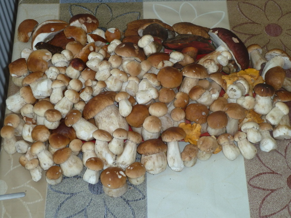 Pomyslný souboj na dálku svedli dva vimperští houbaři, kdo z nich nasbírá více hub a pokud možno za co nejkratší dobu. Na první fotografii je úlovek Antonína Vojvodíka. Tomu stačila na stovku pravých hříbků hodinová návštěva hned na okraji Vimperka. Ještě úspěšněji si počínal Kamil Vácha spolu se svým otcem. V pondělí se vrátili z lesa za dvě hodiny s 385 kousky a druhý den dokonce přinesli 442 pravých hříbků.