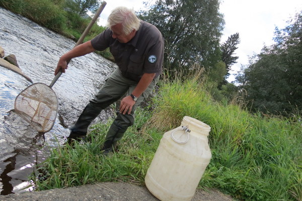 Vlastimil Kučava nabírá jednoroční lipany v rybí líhni