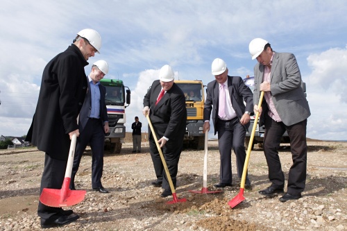 Slavnostní výkop městského silničního okruhu. Zleva: primátor Plzně Martin Baxa, jeho náměstek Petr Rund, hejtman Milan Chovanec, jeho 1.náměstek Jaroslav Bauer a náměstek Ivo Grüner.