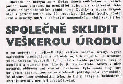 ŠUMAVSKÉ RETRO: Výzva ústředních stranických a státních orgánů dopadla na úrodnou půdu. Občané pochopili, že je třeba každé pracovité ruky a neotáleli s pomocí tam, kde je jí nejvíce potřeba. Mnozí z nich neváhali ani obětovat vlastní dovolenou. Tyto smělé činy jsou nejlepším argumentem srozumitelnosti politiky naší komunistické strany, jsou svědectvím toho, že lid jí chápe a každodenně obětuje své síly pro její uskutečňování.