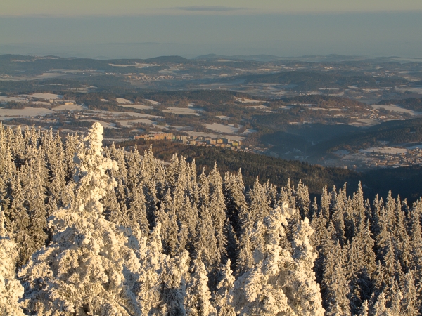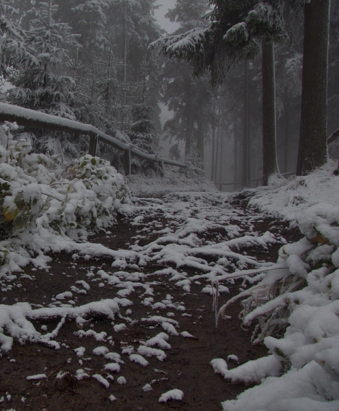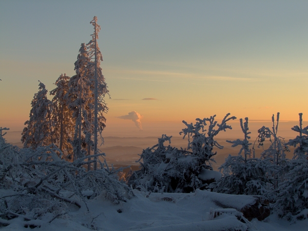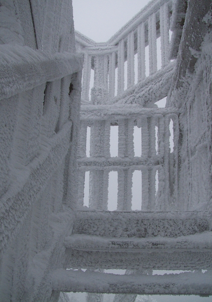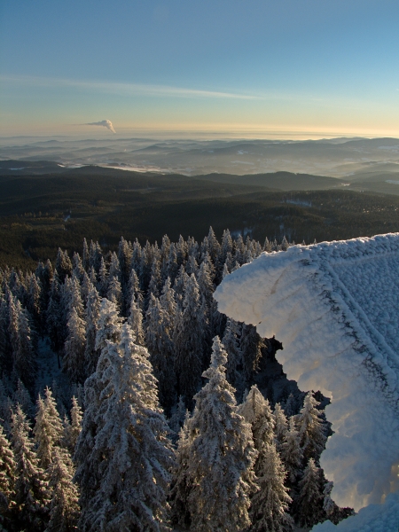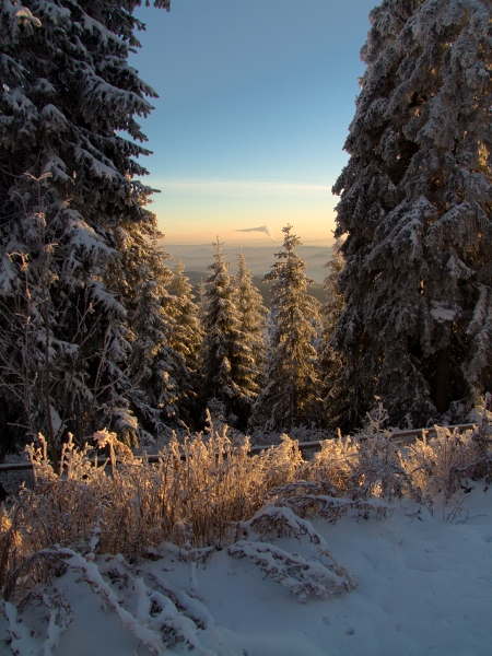… což krátce před neviděným západem slunce (mlha nakonec přece jen zvítězila) potvrdila už jen sama rozhledna. Člověk tu více nežli skutečnost, že dnešního dne naše republika slaví už své čtyřiadevadesáté narozeniny (nepočítáme-li relativně nedávné roztržení původního Československa, o němž je tu vlastně řeč), vnímal sice zatím zcela nepatřičnou, ale přece jen silnou vánoční atmosféru, již prostě tyhle zimní kulisy, ať chceme, či ne, tradičně vytvářejí.