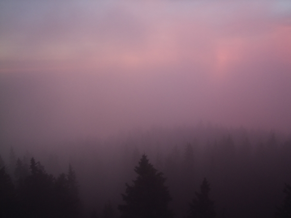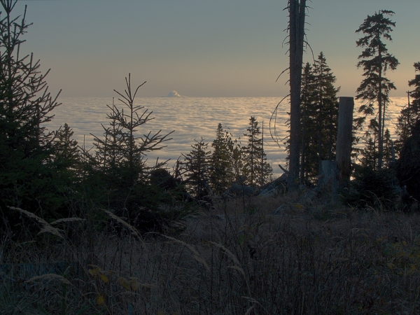 Dnešní výstup na Boubín sice započal na Kubově Huti pod neočekávaně krásně čistou hvězdnou oblohou, ale právě díky tomu bylo jasné, že nahoře bude vše jinak. A bylo – inverze v původní podobě sice ustoupily, ale oblačnost se nasunula do větších výšek, takže na vrcholu mne přivítala doslova tekoucí hustá mlha, jejíž vinou bylo všude dokonale mokro.