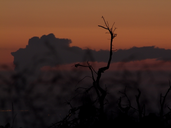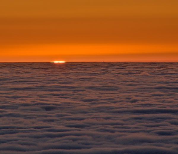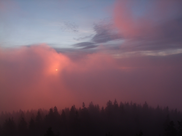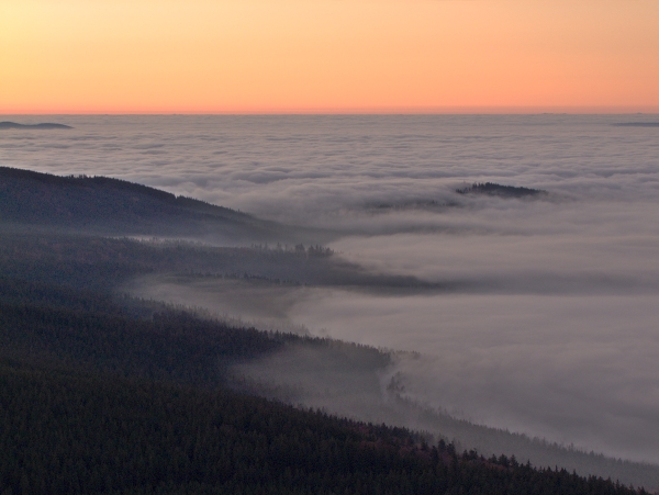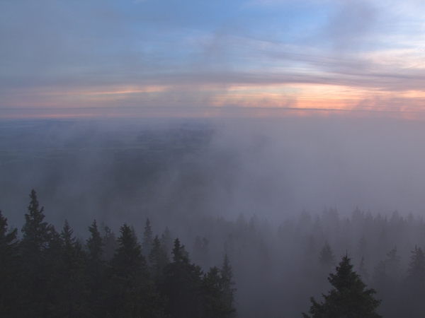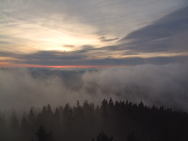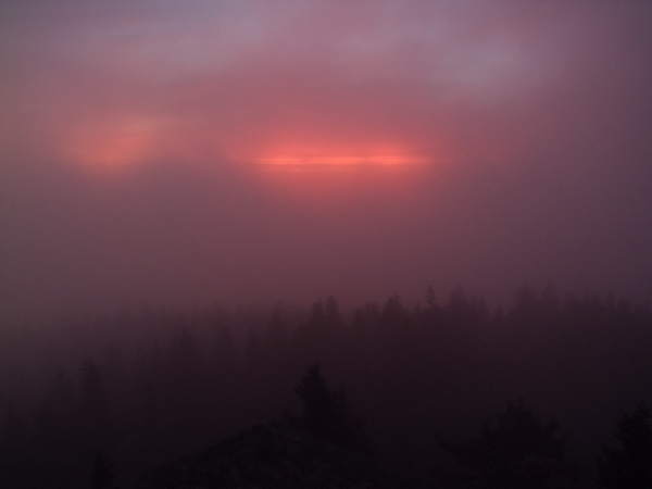 Dnešní výstup na Boubín připomínal tak trochu létání v termice – v průběhu cesty se co chvíli střídaly studené vzdušné proudy s teplými a každopádně bylo možno s ohledem na celkovou venkovní teplotu navzdory časné ranní hodině jít oproti minulému týdnu pouze v košili. Pohled do stále ještě ztemnělé krajiny před rozbřeskem pak nabídl celkové rozvrstvení inverze, jejíž část zaplnila náš dolík už od nočních hodin.