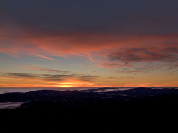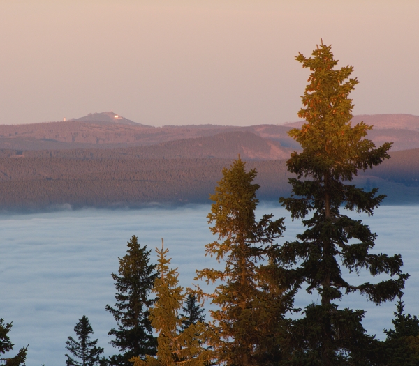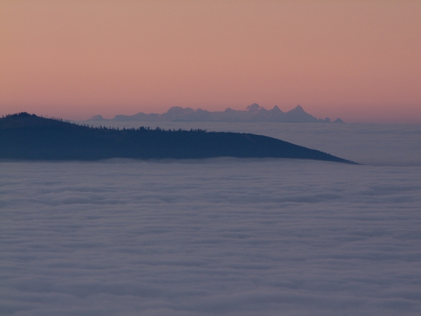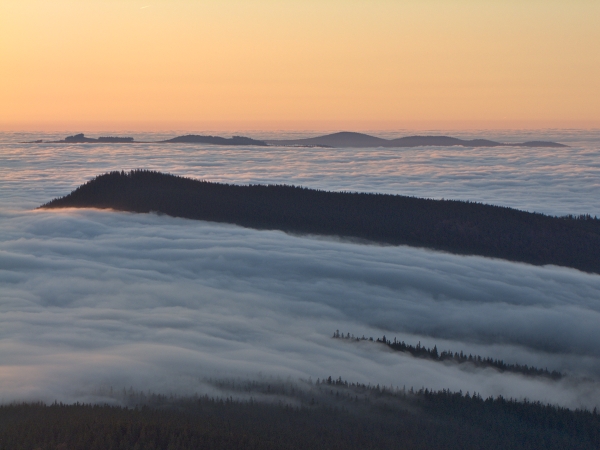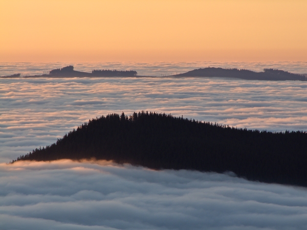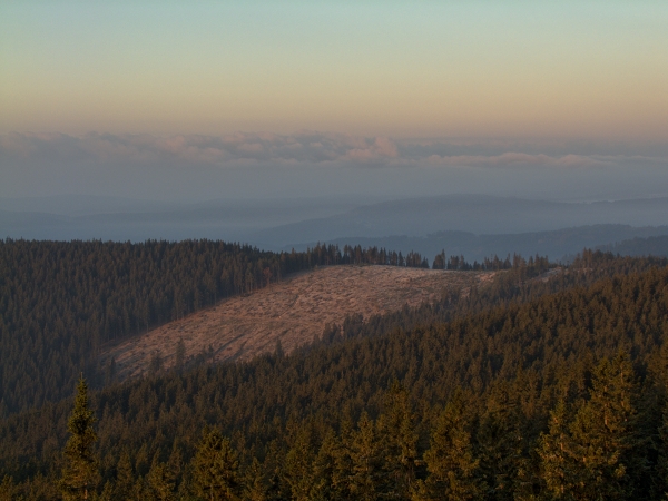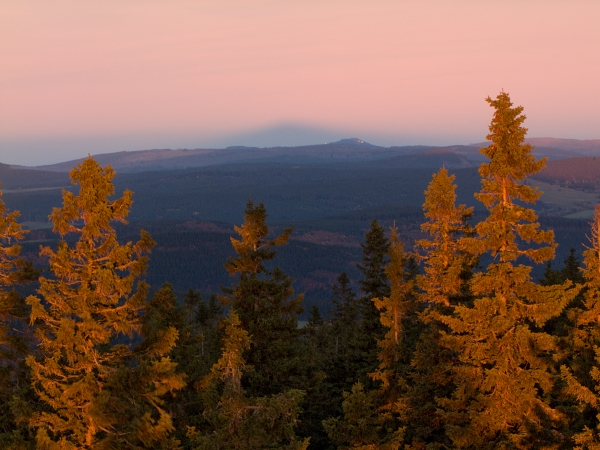 Západní obzor sice nabízel poměrně ostré horské siluety, Boubín však po východu slunce prozradil, že i za nimi se rozprostírá inverzní clona. Jeho stín nad Velkým Javorem jako by symbolizoval, kdo je skutečným horským vládcem Šumavy … 🙂