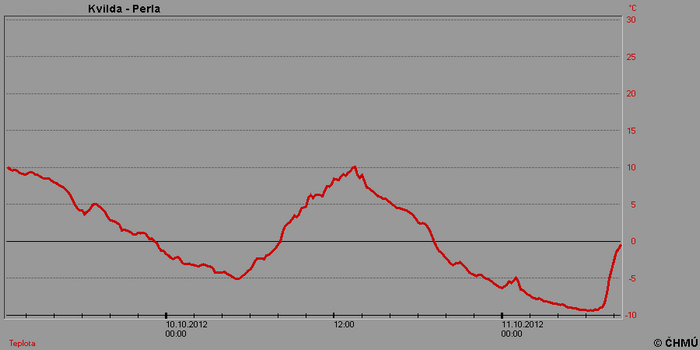 V přílivu chladného vzduchu klesají noční teploty k nule či lehce pod bod mrazu i v nižších polohách Šumavy, 11. října poprvé mrzlo napřiklad ve Čkyni (-1,2°C) či Prachaticích (-1,5°C). Vimperk dle informací našeho spolupracovníka Antonína Vojvodíka zaznamenal na okraji města teplotu -2,3°C, ve Volarech bylo -5,1°C. Teplota na Perle se dostala pod -9°C, což je zatím nejnižší teplota podzimu nejen na Šumavě, ale v celé republice.