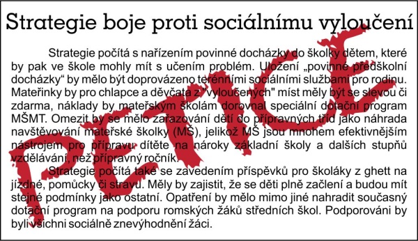 Základní školy v tom případě čekají velké problémy. Pokud jsou do tříd „integrováni „ žáci bez základních sociálních návyků a předpokladů toho, že učivo v běžné třídě ZŠ zvládnou, je tím ohrožena kvalita vzdělávání dětí ostatních. Na jedné straně ministerstvo tvrdí, že je nutné zvýšit úroveň vzdělání našich žáků a podporuje testování žáků v 5. a 9. třídách, na straně druhé považuje integraci žáků ze sociálně znevýhodněného prostředí za jednu ze svých priorit. Stále se ohání velkým počtem romských žáků v základních školách praktických, kteří prý jsou v nich znevýhodněni, a proto pak nemohou najít práci.