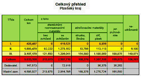 V Plzeňském kraji je celkem 5.033 km udržovaných silnic první až třetí třídy. Nejsou zde žádné úseky silnic označené značkou, která ukládá povinné zimní pneumatiky. Vlastními výkony posypu musí být zajištěna sjízdnost v těchto časových lhůtách od výjezdu posypových mechanismů: I, pořadí – do 3 hodin, II. pořadí – do 6 hodin, III. pořadí do 12 hodin. (rz, tzpk)