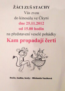 Žáci ze ZUŠ Stachy si pro vás připravili veselou pohádku Kam propadají čerti. Tak vezměte své ratolesti a přijďte se v neděli odpoledne pobavit do