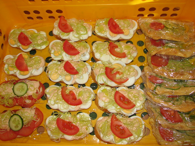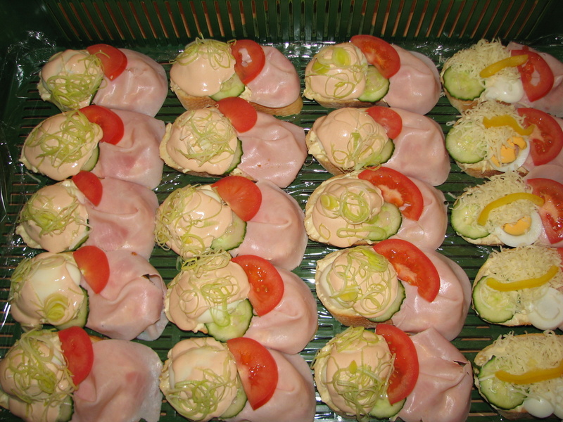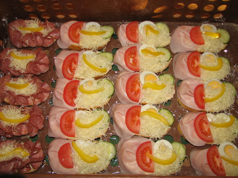 Ano, vyrábíme si sami 4 druhy chlebíčků. Salámové, šunkové, ruské vejce a jarní. Kromě toho pečeme karbanátky, děláme bagety, toastové chleby, saláty. To vše pak rozvážíme zákazníkům. Nedávno jsme pekli na hostinu 1000 řízků, 450 karbanátků a dělali 170 obložených mís. Byla to opravdu 24 hodinová práce.