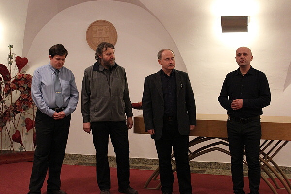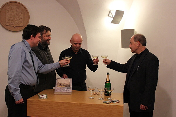 Objemnou knihu čítající 728 stran pokřtili v úterý večer na sušické radnici všichni tři autoři a za vydavatele (město) starosta Sušice – na foto zleva: PhDr. Jan Lhoták, Ing. arch. Jaroslav Pachner, PhDr. Vladislav Razím, Bc. Petr Mottl.