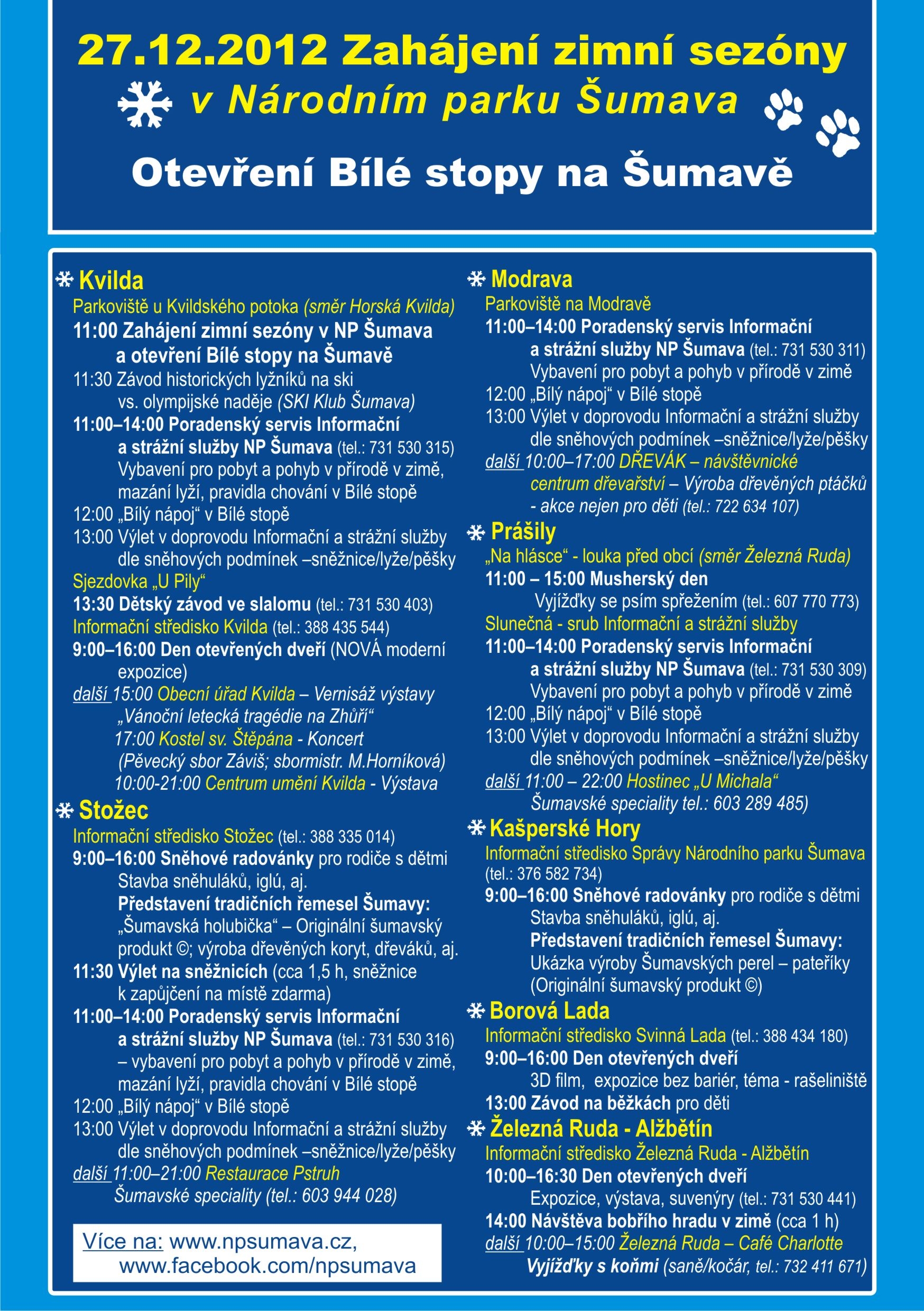 Národní park a chráněná krajinná oblast Šumava připravila ve střediscích na tento den zajímavý program. Podle sněhových podmínek (aktuálně mohou být zařazeny změny) čekají na návštěvníky zajímavé i netradiční akce – na Kvildě závod historických lyžníků na ski, „bílý nápoj“ v Bílé stopě, výstava i koncert, na Modravě výlet a zajímavé centrum dřevařství s výrobou dřevěných hraček, na Prášilech musherský den, Kašperské Hory představí tradiční řemesla, v Alžbětíně můžete navštívit bobří hrad nebo vyjet na projížďku kočárem ad. Pro malé i velké jsou připraveny nejrůznější aktivity na prázdninový den nebo den volna. Více v přiloženém programu (pech, red). ilustrační foto bwp