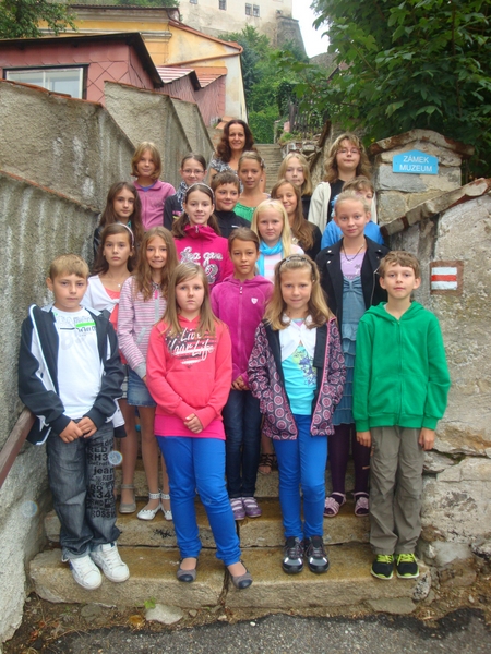 Na Gymnáziu a SOŠe ve Vimperku zahájili v pondělí nový školní rok také primáni s třídní profesorkou Evou Oulickou (foto: Roman Hajník)