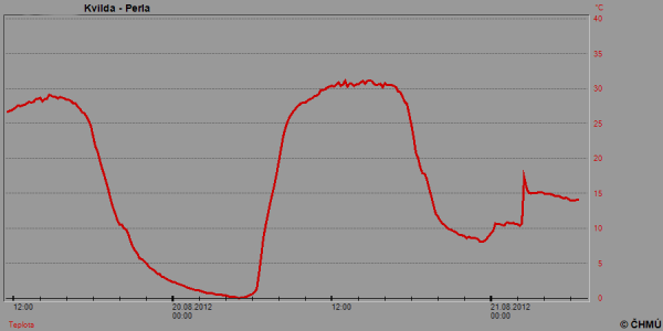 V pondělí 20.července byla naměřena na české území historicky rekordní teplota – ve středočeských Dobřichovicích se teploměr zastavil na 40,4 °C. Také Vimperk zasáhl příliv tropického vzduchu ze severu Afriky a Pyrenejského poloostrova. Antonín Vojvodík zaznamenal v pondělí na své meteorologické stanici za čističkou 35,8 °C, což podle jeho měření je třetí nejvyšší naměřená teplota ve Vimperku za posledních 55 let. Zatímní rekord patří 27.červenci v roce 1983, kdy se teplota zastavila na 36,3 °C. Zajímavý, skoro až neuvěřitelný, teplotní výkyv během jednoho dne zachytila meteostanice Perla u Jezerní slatě nedaleko Kvildy. Rozdíl teplot tam činil 31,3 °C – ráno rovná nula a odpoledne 31,3 °C!