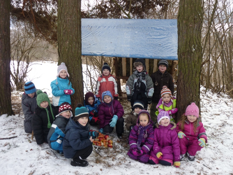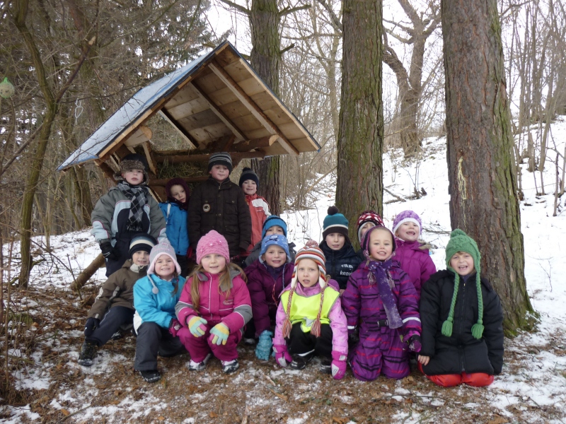 Dřevěné korýtko naštěstí zůstalo celé, takže jsme zvěř o nic neochudili. Tento výlet byl pro děti lekcí – ne každý člověk si váží přírody, má ji rád a stará se o ni! Naštěstí nejen nám nebyl osud krmelce lhostejný, a tak do školky zanedlouho přišla radostná zpráva přímo od Mysliveckého sdružení Šumava. Myslivci, starající se o hrabickou honitbu, odstranili zbytky zničeného krmelce a postavili zcela nový, který rovnou zásobili senem, obilím a solí. Neváhali jsme a vyrazili s dětmi na kopec u Hrabic. Zásoby pro zvěř jsme doplnili o jablka, mrkve, suché pečivo a lojové koule pro ptáky. Děti měly velkou radost, že máme opět místo, kde se můžeme i my trošku starat o zvěř. Malý zastrčený krmelec v Hrabicích je pro desítky dětí z obou našich mateřských školek i paní učitelky důležitým místem, které máme rádi. Učíme se tu o přírodě, protože ta je nám učebnou. Je dobře, že i v Hrabicích to vědí, a že místní myslivci udělali vše pro to, abychom zde i nadále mohli objevovat přírodu. Tak třeba u krmelce na viděnou?