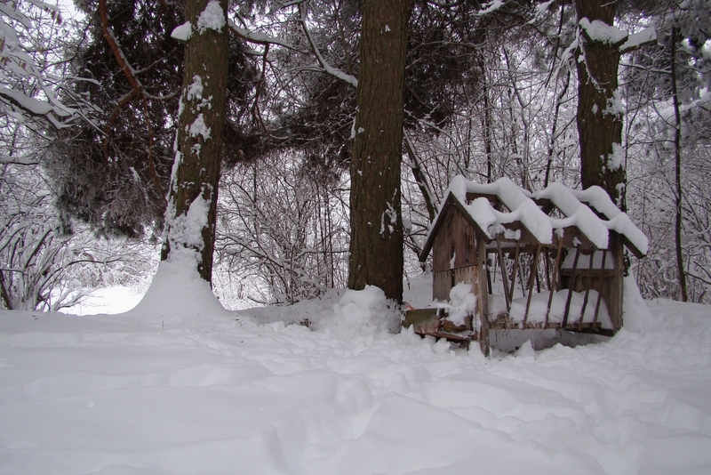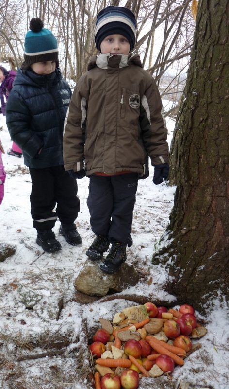 Do batůžku jsme přibalili jablíčka, mrkve, něco kaštanů nasbíraných na podzim, suché pečivo a dokonce i nějaké to voňavé seno a mohli jsme vyrazit. V závějích bílého sněhu děti hledaly stopy zvířat. Poznali jsme, že nám cestu křižovali zajíci, myšky, kosové a dokonce i liška. Na stráni nad námi jsme zahlédli dvojici srnek. Mnoho stop směřovalo stejným směrem jako my, ke krmelci. Sotva jsme se k němu přiblížili, čekalo nás nemilé překvapení. To, čemu jsme dříve říkali krmelec, bylo teď spíše jeho torzem. Nějaký ničitel zdemoloval celou střechu a odsoudil tak lesní jesličky ke zkáze.