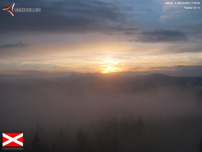 Webové kamery portálu Šumava.eu zachytily v minulém týdnu opět krásné záběry. Nádherný východ slunce ze Svatoboru, lehce mlhavé a mrazivé ráno ve Volarech, alpské vrcholy z Vítkova Kamene či odkapávající vodu z rampouchu na Dobré Vodě, to je jen část nejhezčích snímků. Webkamera na Filipově Huti zachytila nasouvající se mlhu, část duhy vyfotila kamera v neděli 10. března na Vítkově Kameni.