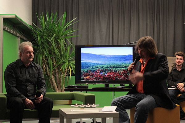představil nejen své poslední publikace, ale podobně jako Vladěna Tesařová, se pustil do dalšího vyprávění. O leckdy adrenalinovém životě fotografa, který se snaží ulovit ten NEJ záběr. Po celou dobu, kdy ho zpovídal Radek Nakládal, se za jejich zády promítaly dechberoucí fotografie z těch nejkrásnějších míst Šumavy.