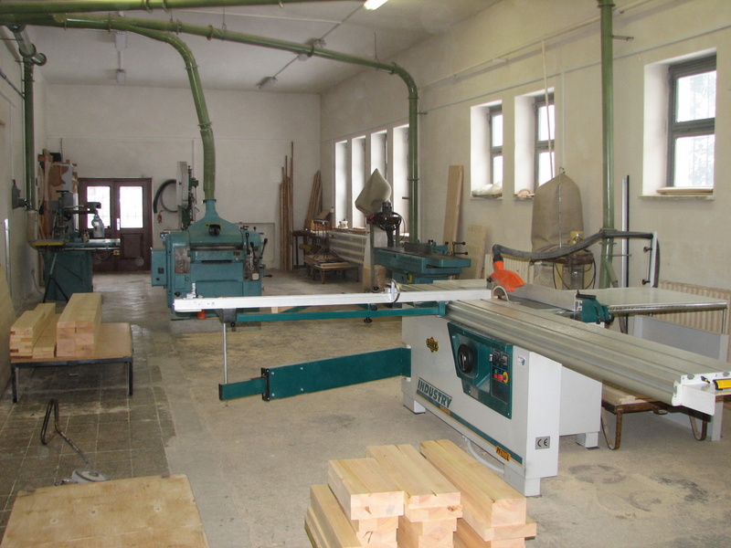 Strojové vybavení zde máme ve velkém, dávali jsme ho dohromady přes rok. Používáme litinové stroje, které dosud doba nepřekonala, jsou spolehlivé a odvádí dobrou práci. K dispozici máme dvě pily, tzv. rovnačky – srovnávací, tloušťkovací frézu – protahovačku, frézy, vrtačky a k broušení egalizační brusku.