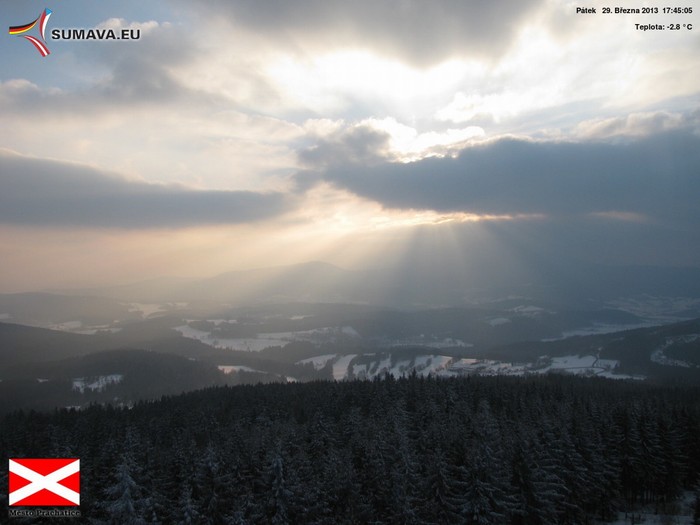 Poslední březnový týden byl na pěkné záběry z webkamer poněkud skoupý. Slunečního svitu bylo opět málo, obloha byla většinou zatažená, v horských polohách často mlhavo. Kamera v Horní Plané zachytila svítící měsíc na Lipnem, kamera na Vítkově Kameni stromy obalené sněhem a námrazou. Silné sněžení zdokumentovala webkamera na Bučině, slunce prosvítající přes mraky zaznamenala webkamera na vrcholu Libín.