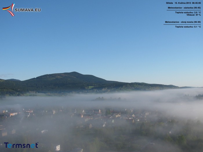 Další květnový týden přinesl rozmanité záběry z šumavských webkamer. Počasí nám namíchalo od všeho něco. Krásné svítání zachytila webkamera ve Vimperku v pondělí 13. května. Tentýž den dopoledne se přes Březník přehnala silná sněhová přeháňka. Středeční chladné ráno s jasnou oblohou dokumentují záběry z dvou webkamer na Vítkově Kameni, kde byly k vidění opět alpské vrcholy. Nízkou vrstvu mlhy, která zahalovala město Volary, zachytila webkamera z místního 90 metrů vysokého komína. Lehce mlhavé ráno bylo i ve čtvrtek 16. května k vidění z vrcholu Svatobor nad městem Sušice. Mlhu nad Lipenskou přehradou bylo možné pozorovat v Černé v Pošumaví v neděli 19. května.