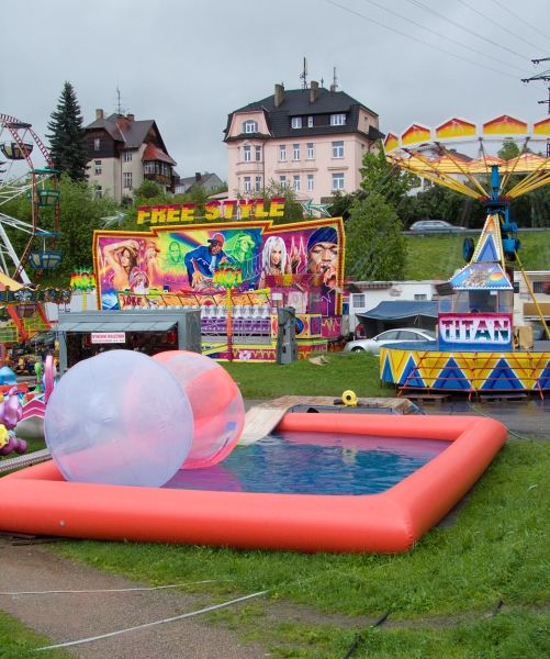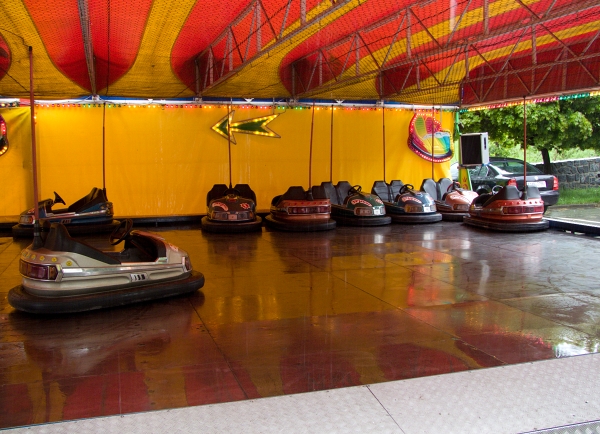 Roztočený velký řetězák s všehovšudy asi třemi odvážlivci, ochotnými podstoupit jízdu připomínající spíše jakousi zvláštní sprchu, působil navzdory tradičně znějící pouťové hudební kulise vinou neustávajících vodních přídělů shůry poněkud nepřirozeně – normálním se ze všeho zdál snad jedině bazén v popředí, který ovšem ve skutečnosti vlastně bazénem původně být neměl.