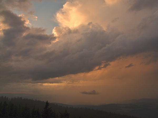 Ať už onen předchozí mrak vyvolal jakoukoli představu, jisté je, že bouřka se dostavila – ovšem opět dále, tentokrát západněji od nás, třebaže si tu zabrumlala o něco výrazněji nežli ta z předvčerejška. Ba dokonce i sprchlo – ve městě spíše ovšem jen k symbolickému spláchnutí prachu. Večerní Boubín pak Vimperk a okolí ukázal v oparu, …