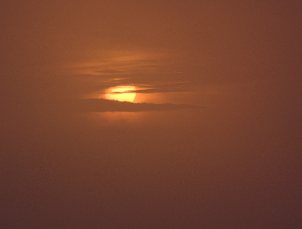 V místě, kde se mělo okolo páté hodiny ukázat sluníčko, zprvu jako by hrozilo souvislé zataženo, ale v daný čas se přece jen objevil důvěrně známý krvavě (jak už bylo na stránkách této fotokroniky v minulosti jednou zmíněno, není v moci digitálního fotoaparátu zachytit v takovém okamžiku věrně to, co je ve skutečnosti viděno – sluneční kotouč vyjde na snímku vždy nepřirozeně bílý nebo žlutý) zářící bod …