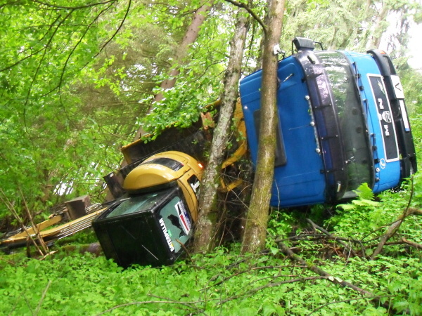 Nejprve kolem půl čtvrté na komunikaci u Svojší, kde se do příkopu převrátil nákladní vůz MAN i s nákladem který převážel – bagrem. Nehoda se naštěstí obešla bez zranění, ale na vyproštění těžké techniky musela být přivolána ještě těžší. Na místě kromě sušických a kašperskohorských hasičů zasahovala asistenční služba Klatovy, vyproštění probíhalo pomocí jeřábu do nočních hodin.