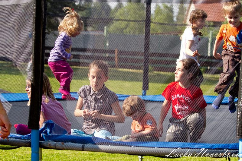 A protože počasí se nakonec umoudřilo, děti si zaskotačily na trampolíně, projely se v motokáře a pomaličku usychaly na sluníčku.