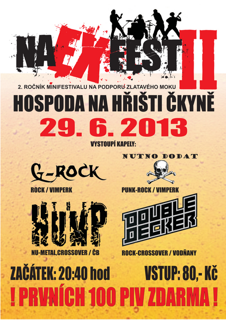 naexfest IIV sobotu 29.6.2013 se koná v HOSPODĚ NA HŘIŠTI druhý ročník NA EX FESTu, minifestivalu na podporu zlatavého moku. Akce začíná ve 20:40. Vstupné je 80 Kč.