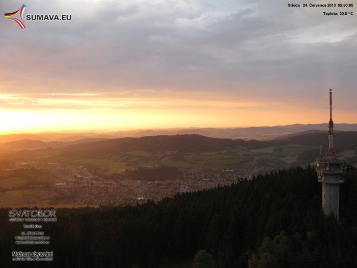 Máme za sebou nejteplejší týden roku, který přinesl plno zajímavých záběrů z našich webkamer. Velmi chladné ráno zaznamenala v pondělí 22. července kamera na Horské Kvildě. Lokální přeháňku zachytila v úterý kamera nejen ve Volarech ale také z Libína, což je vidět na záběru úplně vlevo. Středa přinesla krásný východ slunce na Svatoboru nad městem Sušice. Páteční večer 26. července v přeplněném kempu u Černé v Pošumaví nabídl krásný západ slunce. Sobotní odpoledne a krásný bouřkový oblak z Vítkova Kamene. Nedělní večer byl bouřlivý v západní části Šumavy, pěkný blesk byl k vidění z Korábu u Kdyně.