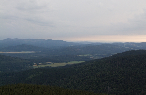 … ale, málo platno, výhled k dalším dvěma šumavským rozhlednám – na bližším Sedle a vzdálenějším Javorníku – by byl bez soudobého ohavného ocelového monstra zajisté mnohem půvabnější.