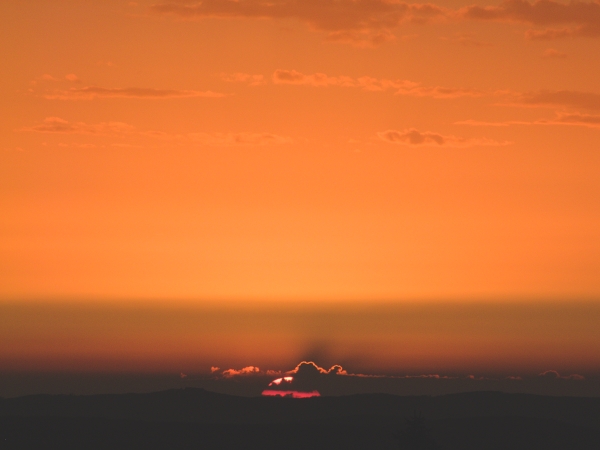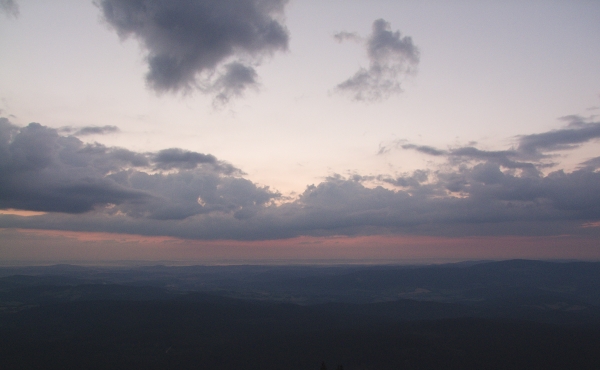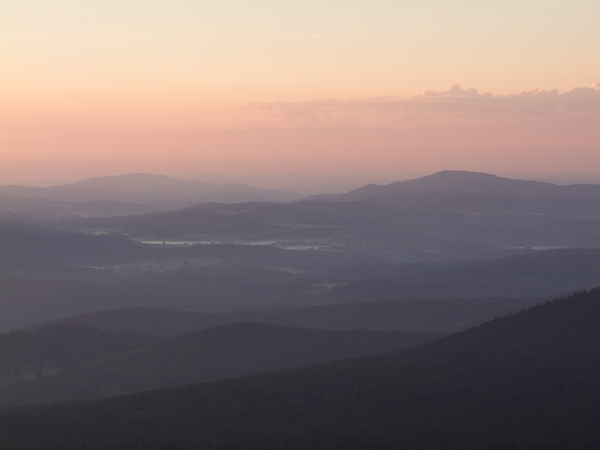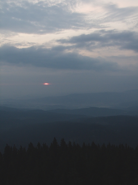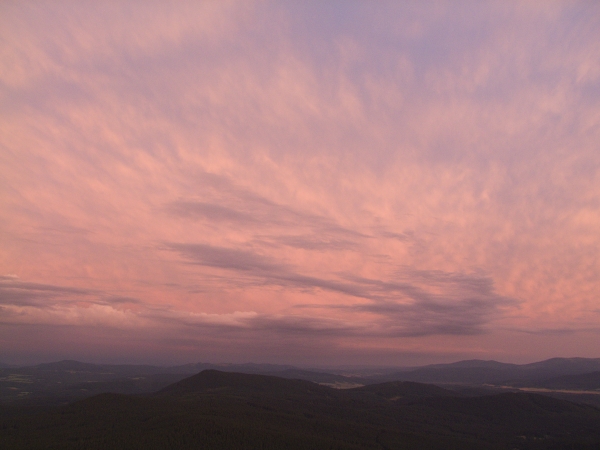 Pohledem pod stále barevnějšími oblaky za Kleť a další vrcholy je zřejmé, že rovinaté Českobudějovicko se patrně příštího rána probudí v mlhách.