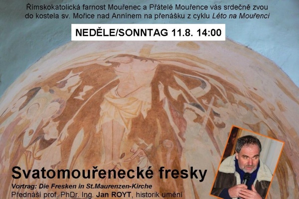 V neděli 11. srpna od 14 hodin bude o mouřeneckých freskách přednášet historik umění prof. PhDr. Ing. Jan Royt, který mimojiné přednáší v Ústavu dějin křesťanského umění KTF UK.