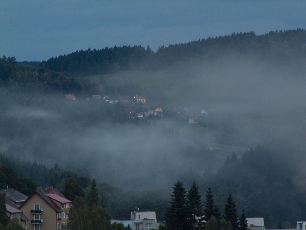 V pondělním jitru se po deštivé noci zdají Výškovice být ponořeny do inverze – ta je však, bohužel, produktem jednoho z vimperských komínů …