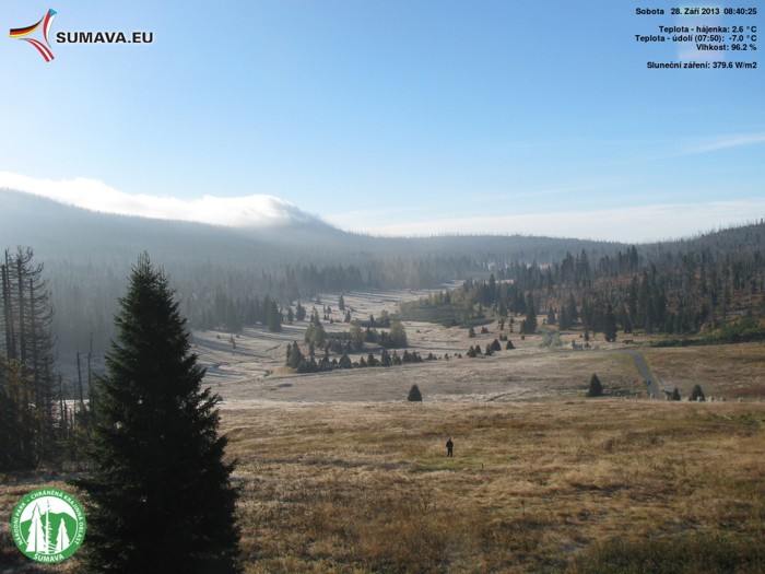 Poslední zářijový týden přinesl velmi pěkné záběry, většina z nich je z víkendu 28. a 29. září. První záběr je z Libína, pohled západním směrem v pondělí 23. září v podvečer, kdy sluneční paprsky nádherně prosvítaly přes oblačnost. V úterý 24. září ráno byly vidět Alpy z Vítkova Kamene. Sobotní ráno bylo na Šumavě nejmrazivější na Březníku. To si nenechal ujít zřejmě nějaký fotograf, který je vidět na louce na snímku zhruba uprostřed. Svítání ze Svatoboru, to už je klasika, která se ale rozhodně neokouká. Velmi pěkný záběr zachytila kamera na Filipově Huťi, pás mlhy valící se přes Modravu. Nedělní ranní obloha přinesla velmi pěkně zbarvenou oblačnost, což dokládají záběry z Volar, Svatoboru, Černé v Pošumaví a Horní Plané, kde se ke zbarveným oblakům přidala i duha.