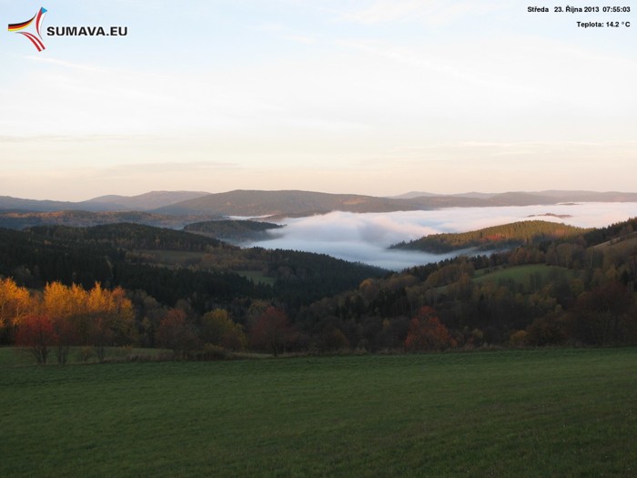 Poslední dny jsou na Šumavě opravdu velmi teplé. Minulý týden jsme slibovali v předpovědi „dvacítky“ a teploty na mnoha stanicích tuto hodnotu překonaly. V neděli večer přešla přes západní část Šumavy, konkrétně přes Železnorudsko, Klatovsko a Sušicko bouřka, která v říjnu není zrovna obvyklým jevem. Jak sdělil Český hydrometeorologický ústav, bouřka v říjnu se na našem území vyskytuje zhruba jednou za 5 let. Po slunečném víkendu bylo od pondělí na obloze sice více oblačnosti, teploty ale byly na třetí říjnovou dekádu nadále nadprůměrně vysoké. Nezvykle vysoké jsou nejen denní teploty, ale i ty noční. Konkrétně středeční ráno přineslo na Šumavu obrovské teplotní rozdíly. Teploty se nejčastěji pohybovaly kolem 8°C až 13°C, velmi teplo bylo i v horských polohách, kde byly až na vyjímky ranní teploty až kolem 16°C nad nulou. Nejchladněji bylo ve Volarech, kde bylo naměřeno minimum -2,8°C, jen o pár desetin tepleji bylo na Hliništi.