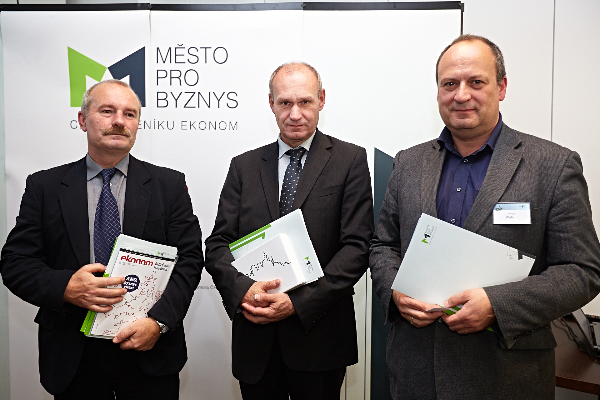 Zleva: Vedoucí MÚ Nýřany – Pracoviště Plzeň Lubomír Šilhavý (3. místo Město pro byznys Plzeňského kraje 2013), ředitel společnosti EuWe Eugen Wexler ČR Petr Krob, který na vyhlášení zastupoval město Rokycany (1. místo Město pro byznys Plzeňského kraje 2013) a místostarosta Klatov Václav Chroust (2. místo Město pro byznys Plzeňského kraje 2013)