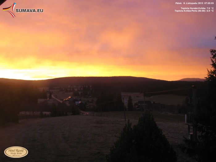 Počátek listopadu přinesl další velmi zdařilé záběry z našich webkamer. V úterý 5. listopadu byl pěkný západ slunce z Libína. Hned druhý den ráno, stejná kamera zachytila duhu po dešťové přeháňce. Do bílého rána se tentýž den probudili obyvatelé Filipovy Hutě. Páteční ráno 8. listopadu bylo na obloze velmi barevné, z Vítkova Kamene byly viditelné alpské vrcholy, nádherně zbarvenou oblohu zachytily kamery na Horské Kvildě a Svatoboru. V neděli večer 10. listopadu pokryla horské polohy vrstva sněhu, což nejlépe dokumentují kamery na Filipově Huti a Bučině.