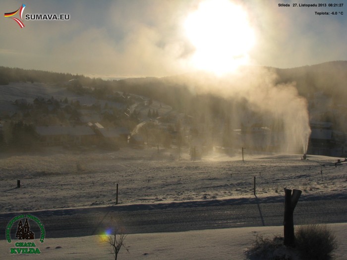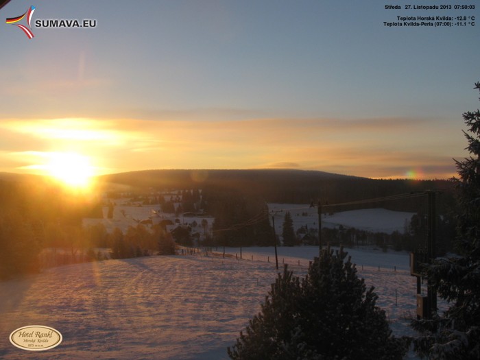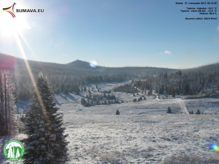 Dnešní ráno, 27. listopadu, se stalo na mnoha místech tím nejchladnějším v nadcházející zimě. Mrzlo na všech šumavských stanicích, minimální teploty však byly hodně závislé na oblačnosti, která se na některých místech rozpustila po půlnoci, jinde však vydržela až do rozednění. Nejnižší teploty zaznamenaly mrazové kotliny Perla a Rokytská slať, kde teploty klesly na -17°C. Pod hranici -16°C klesla teplota na dalších dvou šumavských stanicích, na Březníku a na Horské Kvildě. Lehce pod -14°C poklesla teplota na Hliništi. Pod -10°C zaznamenaly ještě stanice Churáňov, Kvilda – chata, Prášily, Řasnice – Mlýn nebo Velhartice.