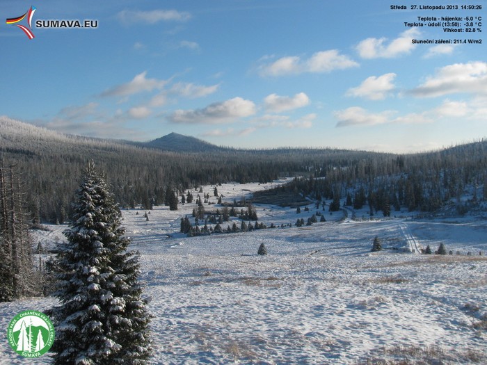 Ochlazení, které jsme slibovali minulý týden, dorazilo na Šumavu přesně podle předpokladů a to z neděle na pondělí. Celý víkend se teploty ještě držely nad bodem mrazu, zlom přišel v neděli večer, kdy teploty klesly pod nulu a dešťové přeháňky a mrholení přešlo ve slabé a občasné sněžení. Sněhu však napadlo maximálně pár centimetrů. Díky teplotám pod bodem mrazu můžou provozovatelé zimních areálů zasněžovat sjezdové tratě. Nejslunečnějším a zároveň i nejchladnějším dnem se stala středa, ranní teploty byly závislé na množství oblačnosti. O mrazivém ránu jsme informovali ZDE. Oblačnost dorazila ve středu až po 21. hodině, díky tomu po západu slunce následoval prudký, ikdyž je krátký, pokles teplot. Nejnižší teplotu zaznamenala meteostanice na Březníku a to -19,8°C, bylo tak stanoveno nové teplotní minimum nadcházející zimy. Ve čtvrtek přecházela přes Šumavu teplá fronta, sněhové srážky přešly v dešťové a mrznoucí, což způsobilo vznik ledovky. V podvečerních hodinách od vyšších poloh přešlo mrholení ve slabé sněžení.