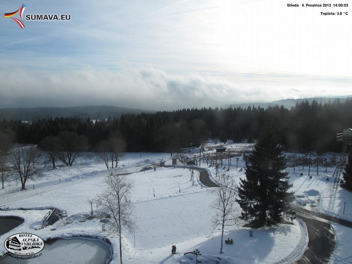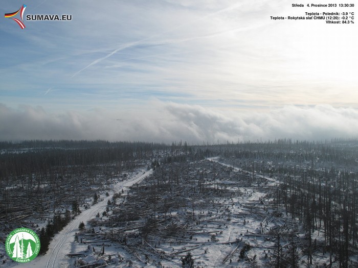 Od čtvrtečního dne však dojde k výraznější změně počasí. Český hydrometeorologický ústav vydal výstrahu na silný vítr, tato výstraha platí i pro celou Šumavu. Vítr bude dosahovat rychlosti v nárazech až 90 km/hod., na hřebenech ojediněle i přes 100 km/hod. K silnému větru se přidají i sněhové srážky. Může za to tlaková níže Xaver, která k nám dorazí od severozápadu. Sněžit by mělo začít ve čtvrtek ve večerních hodinách. Přes den však bude mlhavo, místy polojasno až skoro jasno. Denní teploty mezi 1°C až 5°C. V noci na pátek by mělo napadnout od 1 do 5 cm sněhu, v horských polohách a v Bavorském lese 5 až 10 cm sněhu. V nižších polách půjde o mokrý a těžký sníh, v horských polohách o prachový sníh. V polohách nad 500 metrů se budou vlivem silného větru tvořit sněhové jazyky, v Bavorském lese v horských polohách i závěje.